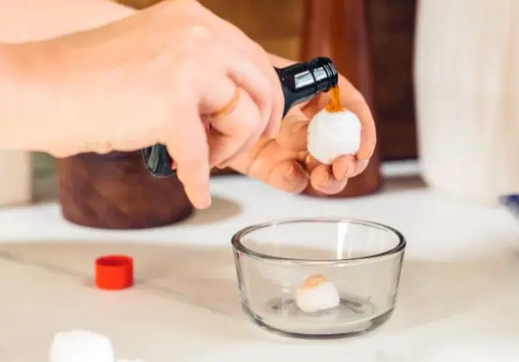So you take the cotton balls—like two or three, doesn’t really matter—and drip some vanilla on them. Not pour. Just enough that they smell like something other than medicine cabinet. If it drips through the cotton, you’ve used enough. You’ll know